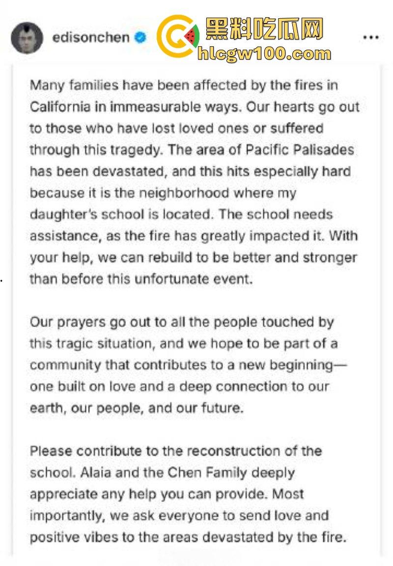 正文 陈冠希呼吁网友给他女儿在美国被山火烧毁的学校捐款 被网友狂怼“你活该”! admin V管理员 /2025-02-12/1阅读/0评论 0212 文章最后更新时间2026年01月02日,若文章内容或图片失效,请留言反馈! 自由美利坚,自由的山火,美国加州洛杉矶爆发野火灾情,几乎造成了几万户家园被摧毁,数十万人流离失所,情况犹如末日灾难。而早前因色情门退圈的香港艺人陈冠希也在社群发文,表达对女儿Alaia所在学校被大火焚烧的震惊和难过。他呼吁支持者捐款帮助学校重建学校,然而他这一行为却引起了网友的反感,被人在推特上狂怼,“这是你应得的”,不过网友这话虽然糙但是理不糙,冠希哥自己潇洒快活的时候可没想着网友,现在有困难了想要让粉丝们平摊了,这些有钱人真是有福不同享,有难同当啊,天下哪有这么好的事情!#陈冠希 #美国 #山火 #捐款 #活该 #洛杉矶 #被骂 #学校 #陈冠希女儿